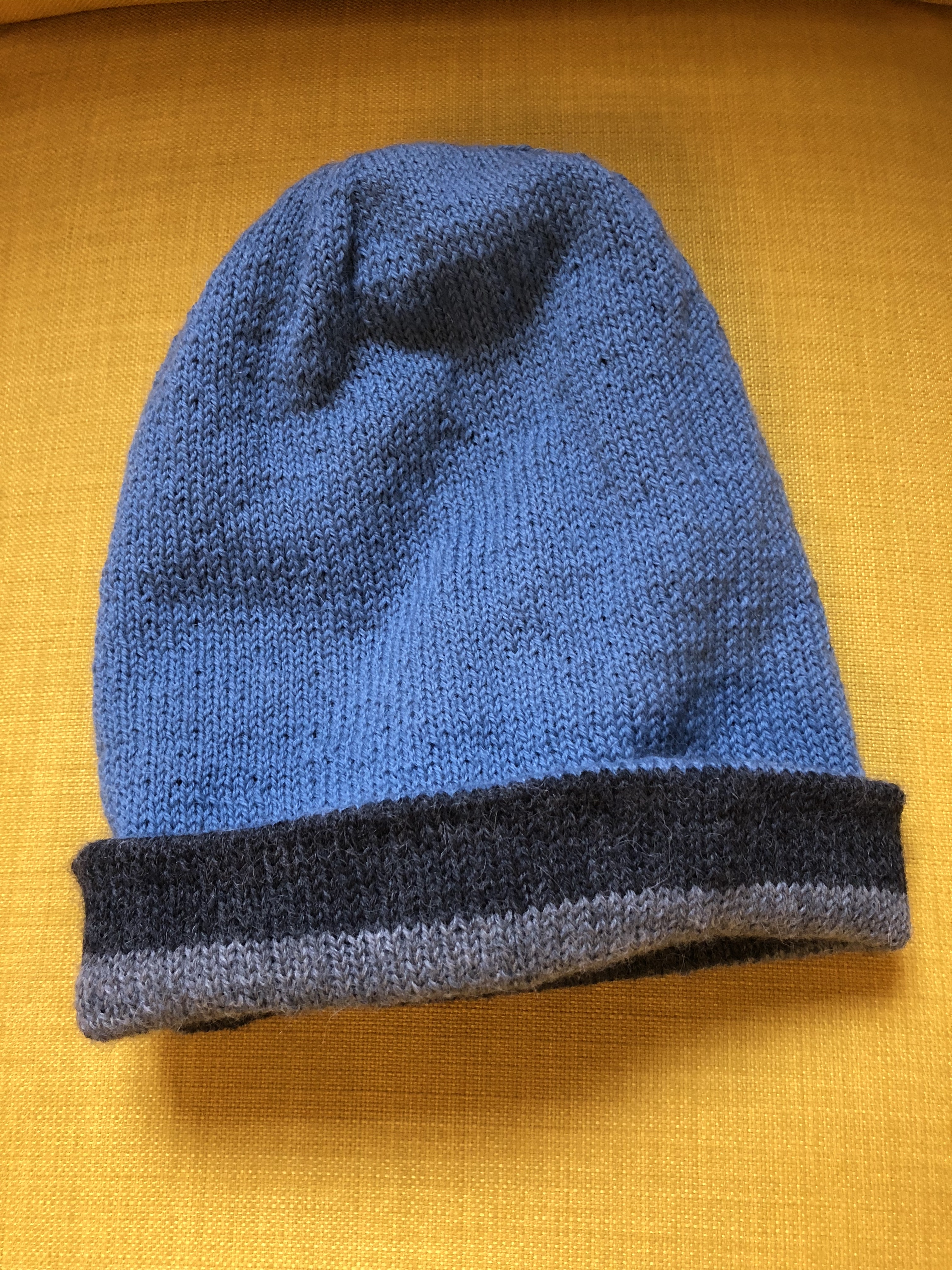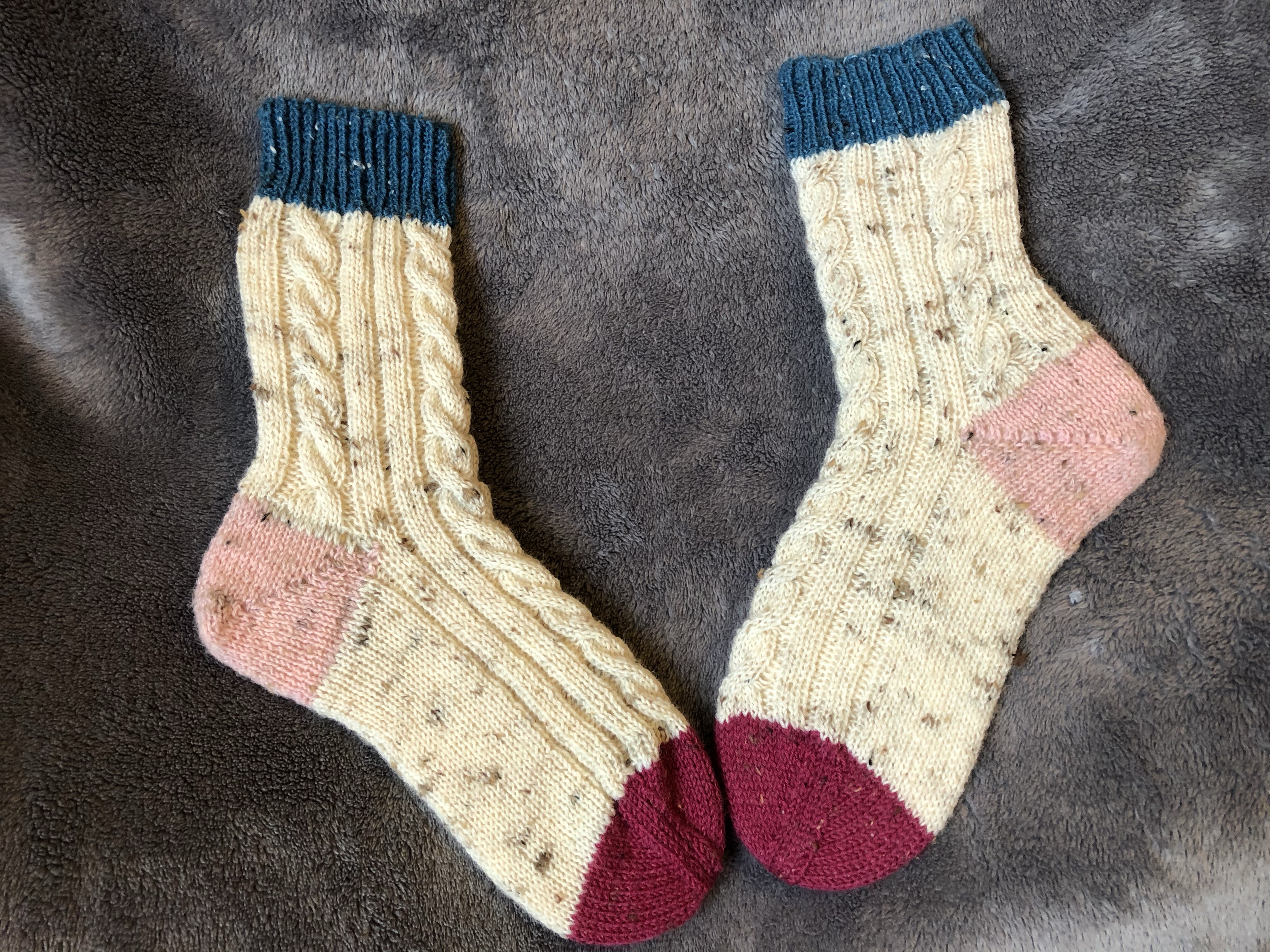 Die letzten Winterbestellungen sind fertig und müssen nur noch ausgeliefert werden. Es sind eine Herren-Wendemütze und ein Paar Damen-Socken mit Zopfmuster.