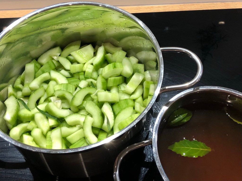 2-2,5 kg Gurken schälen, längs halbieren oder vierteln, das Kerngehäuse mit einem Löffel auskratzen. Das ergibt dann ca. 1,5 kg bearbeitete Gurken. Diese in 2-3 cm dicke Scheiben schneiden und in einen Topf geben.