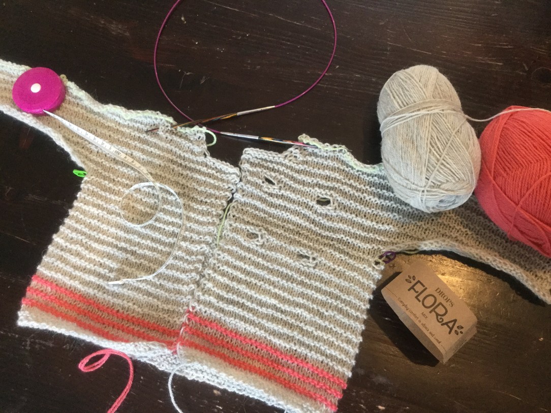 Ich durfte bei einem Teststrick mitmachen. Dieser wunderschöne Mädchenpullover aus Drops Belle (je 100g Kirsche Fb 12 und Altrosa Fb 11) namens Dünenstürmer ist dabei heraus gekommen. Die Anleitung ist inzwischen bei Ravelry unter dem gleichen Namen zu finden. Die Farbauswahl ist mir unglaublich schwer gefallen. Allein beim Einkauf konnte ich mich nicht entscheiden. Deshalb