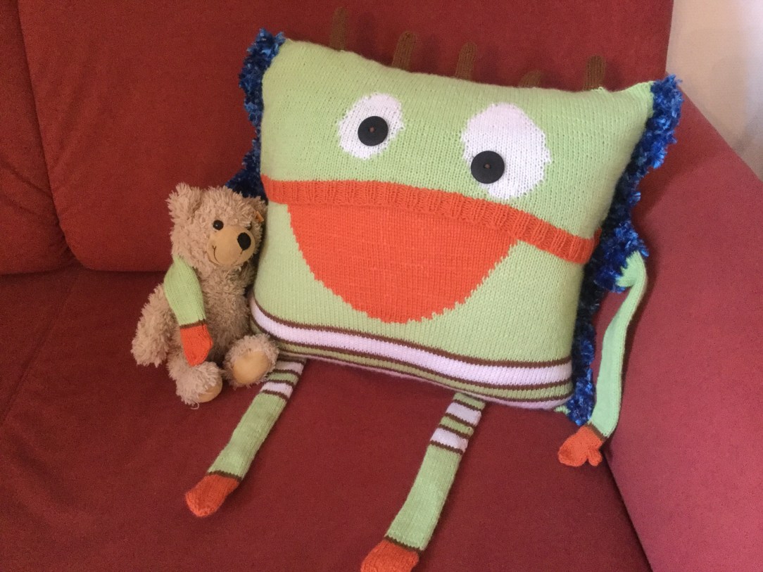 Das Sofa im Kinderzimmer ist schon toll zum Kuscheln oder Vorlesen … naja, eben etwas für die erwachsenen Besucher. Die dazugehörigen Kissen sind auch ganz gemütlich, aber eben furchtbar langweilig für Kinder. Der neue Kissenbezug kommt als friedliches Monster daher. Gearbeitet habe ich den Bezug als langen Schal, den ich an den Seiten mit blauem