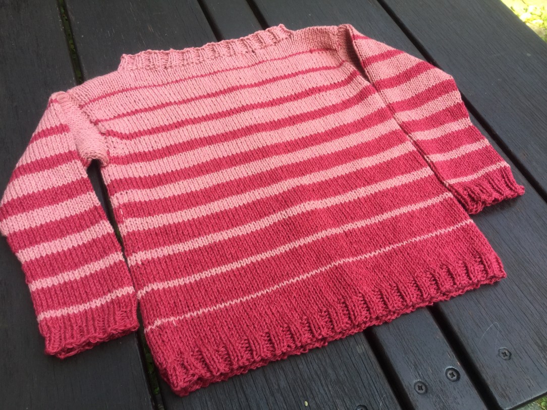 Ich durfte bei einem Teststrick mitmachen. Dieser wunderschöne Mädchenpullover aus Drops Belle (je 100g Kirsche Fb 12 und Altrosa Fb 11) namens Dünenstürmer ist dabei heraus gekommen. Die Anleitung ist inzwischen bei Ravelry unter dem gleichen Namen zu finden. Die Farbauswahl ist mir unglaublich schwer gefallen. Allein beim Einkauf konnte ich mich nicht entscheiden. Deshalb